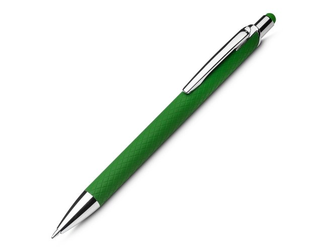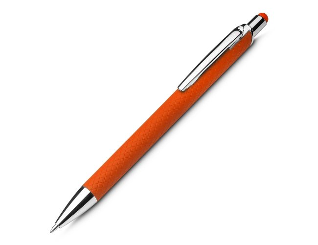 Caneta touch screen em alumínio reciclado com acabamento similar à borracha e corpo texturizado. Acionamento por clique e carga esferográfica azul 1.0mm.