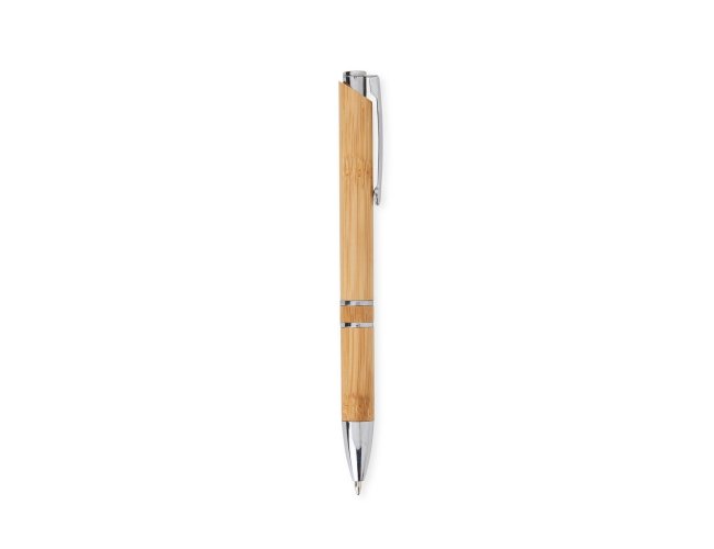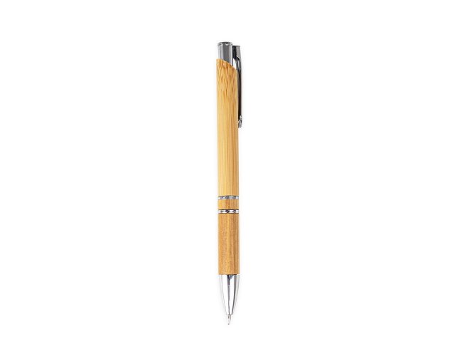 A nossa caneta ecológica de bambu é a opção perfeita para acompanhar uma rotina repleta de registros. Com um design elegante, ela conta com clipe metálico, carga esferográfica azul de 1.0mm e acionamento por clique, unindo praticidade e sustentabilidade. Para torná-la ainda mais exclusiva, acompanha um estojo de papel com estampa que imita bambu.