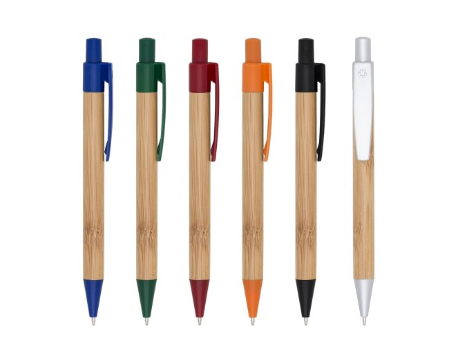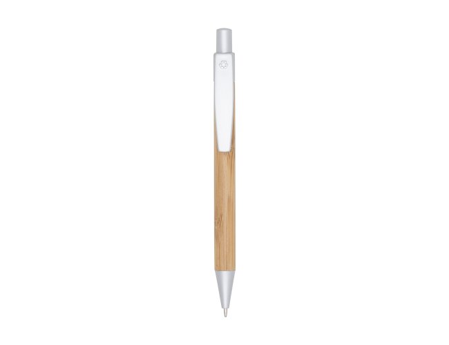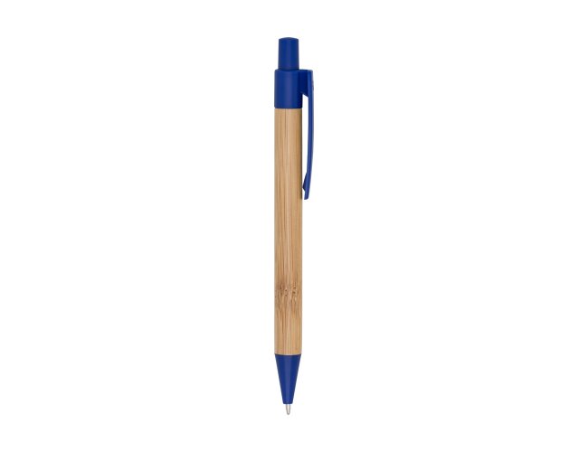 Caneta de bambu com detalhes plásticos, carga esferográfica azul 1.0 mm e acionamento por clique.