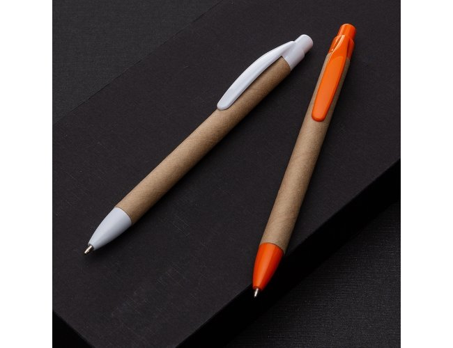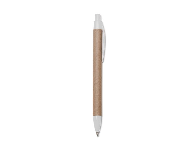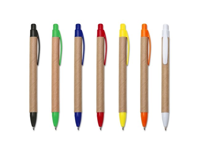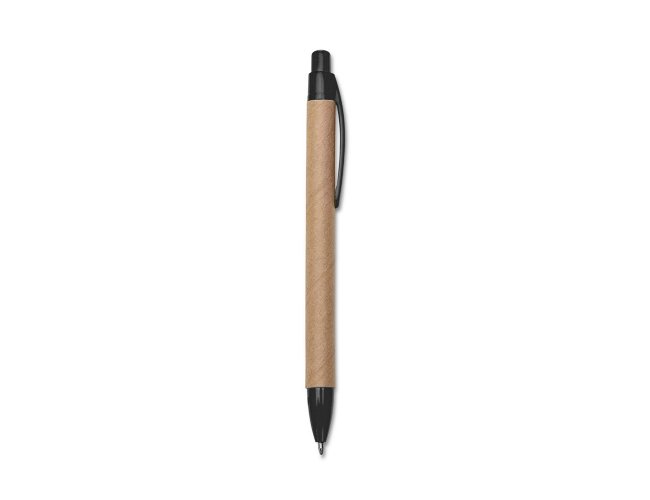 Caneta de papelão com detalhes plásticos, carga esferográfica azul 1.0 mm e acionamento por clique.