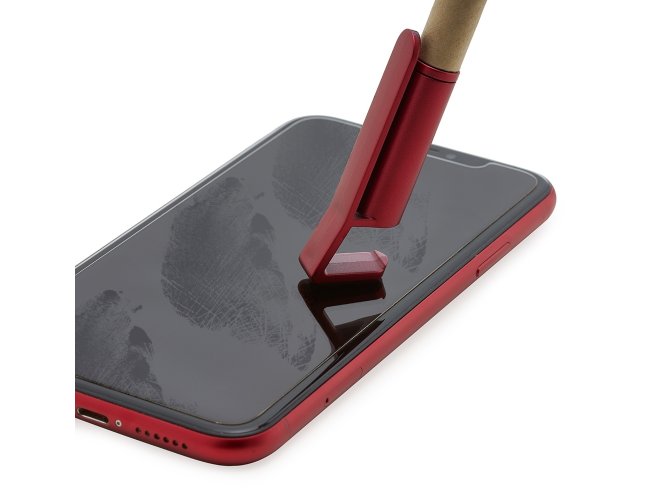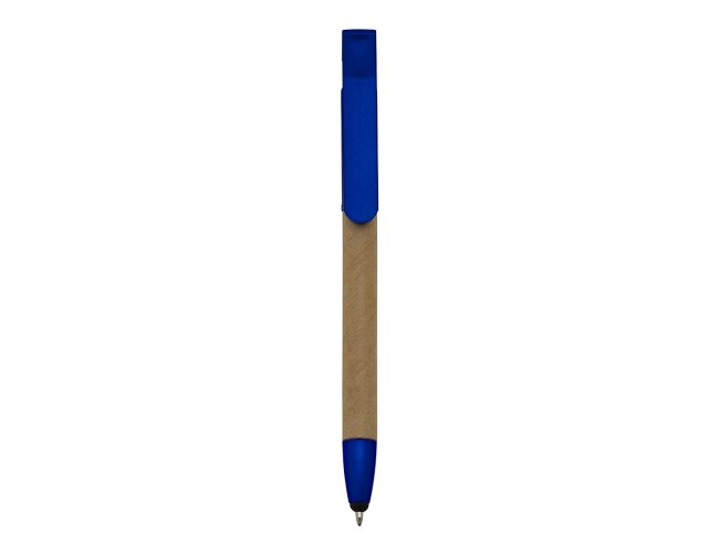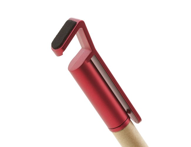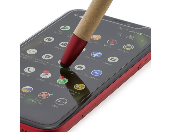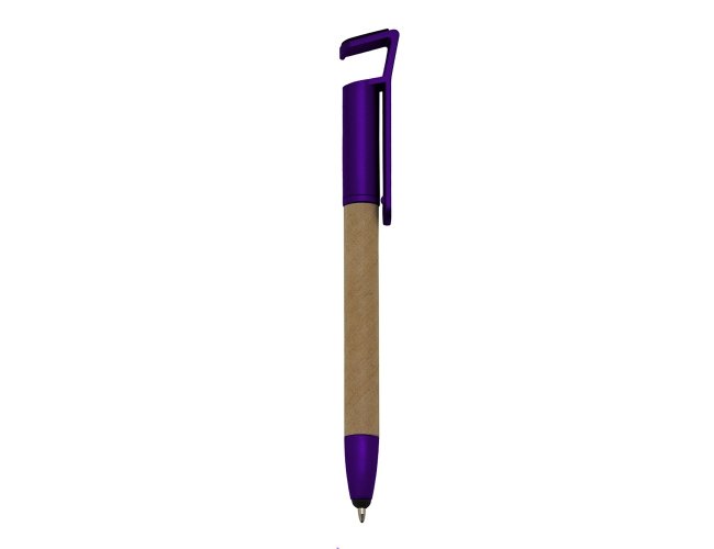 Caneta de papelão com detalhes plásticos, contém suporte para celular, ponteira touch screen e limpador de tela. Carga esferográfica azul 1.0 mm e acionamento por rotação.