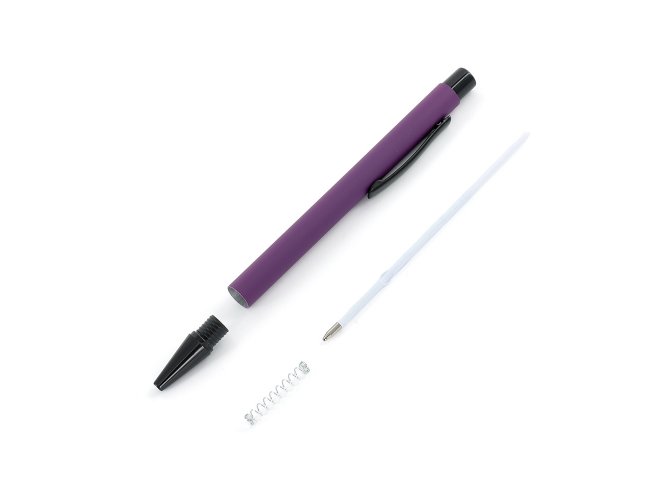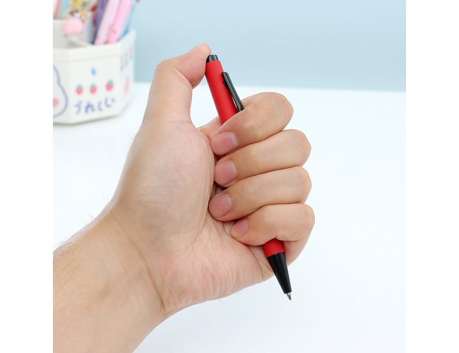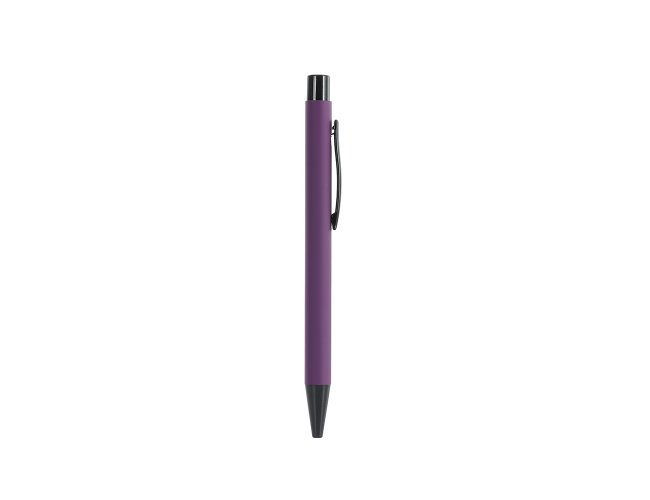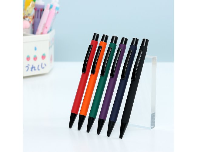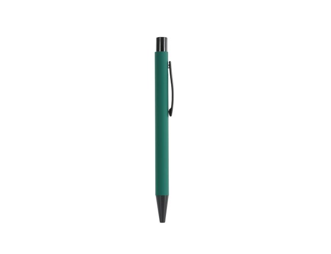 Caneta metálica com acabamento emborrachado, carga esferográfica azul 1.0mm e acionamento por clique.