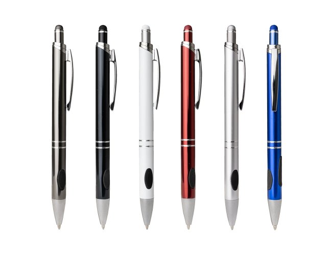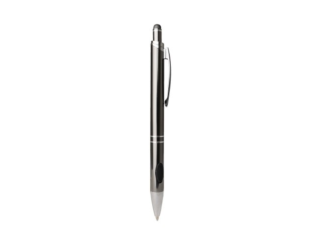Caneta metálica com touchscreen, com detalhe emborrachado na parte inferior, carga esferográfica azul de 1.0 mm e acionamento por clique.
