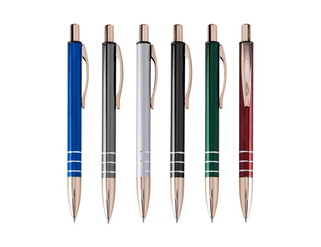 Caneta metálica com carga esferográfica azul 1.0mm e acionamento por clique.