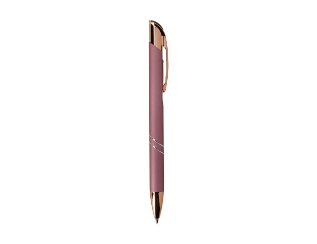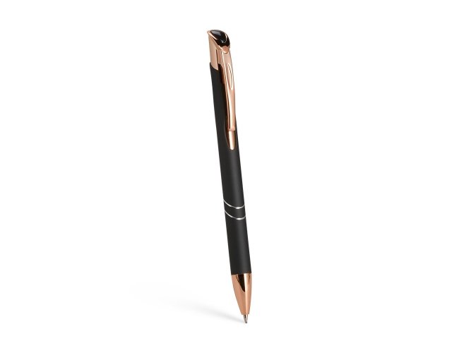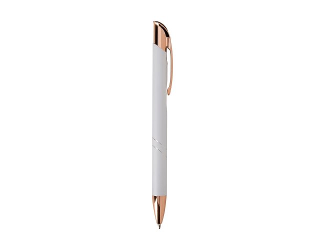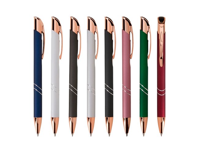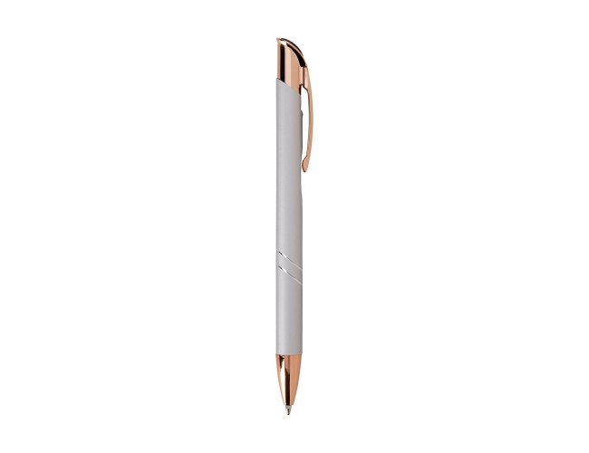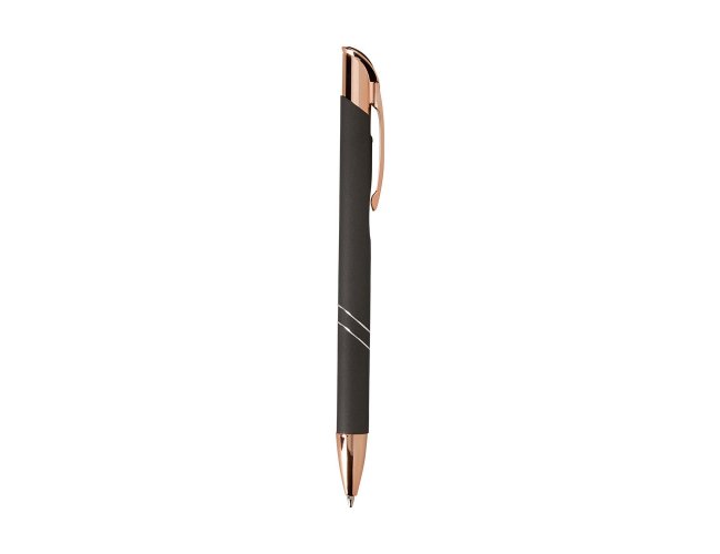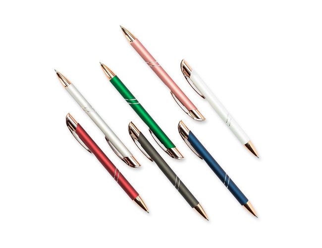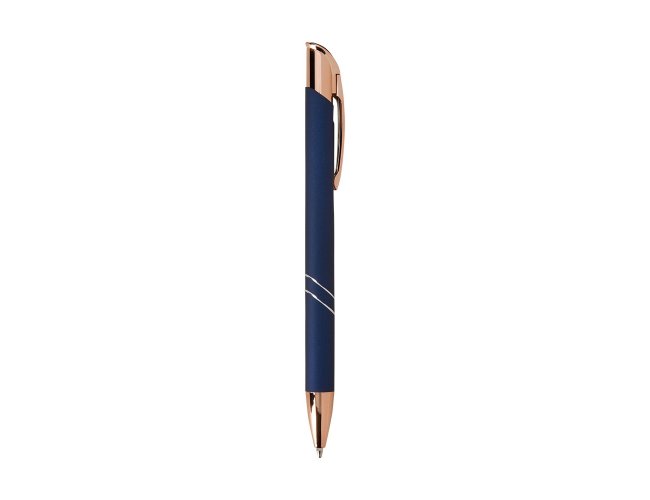 Caneta metálica com detalhes em plástico, acionamento por clique e carga esferográfica azul de 1.0mm, o que proporciona uma pegada leve e uma escrita precisa.