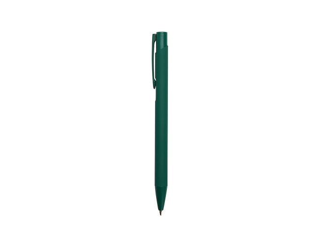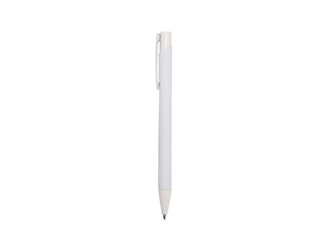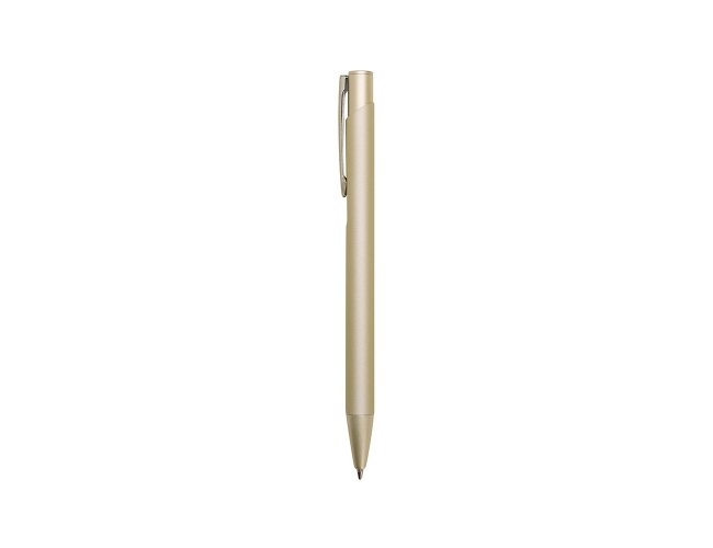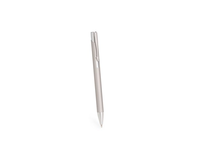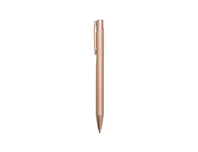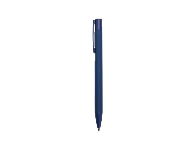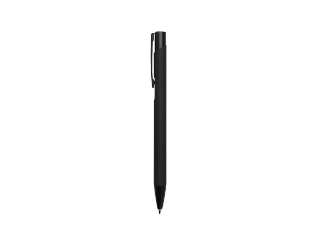 Caneta metálica com ponta e clip em plástico. Possui acionamento por clique e carga esferográfica azul de 1.0mm.