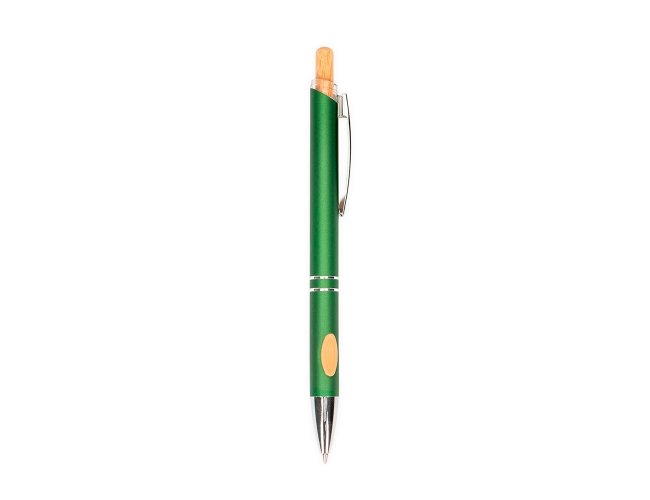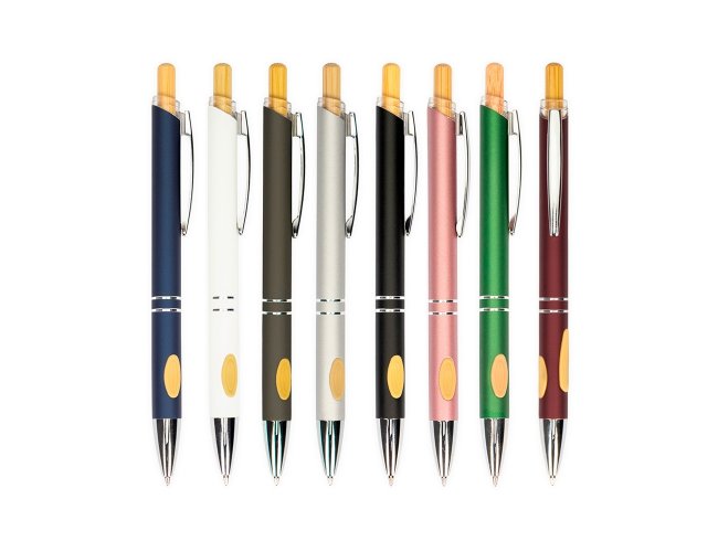 Caneta metálica com detalhes emborrachados no corpo, acionamento por clique com parte superior em bambu, carga esferográfica azul de 1.0mm, o que proporciona uma pegada leve e uma escrita precisa.