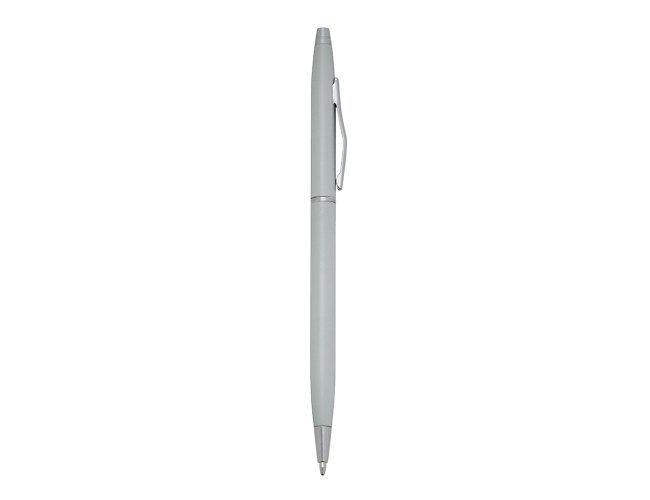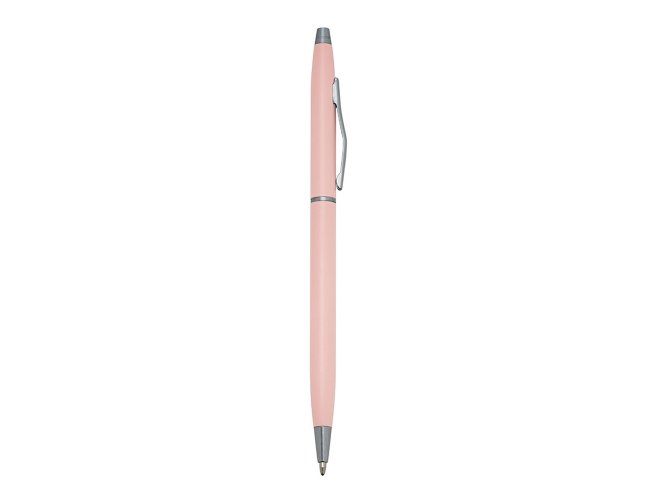 Caneta metálica com carga esferográfica azul 1.0 mm e acionamento por rotação.