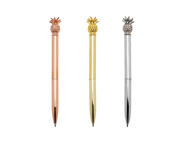 Caneta metálica com carga esferográfica azul e acionamento por rotação.