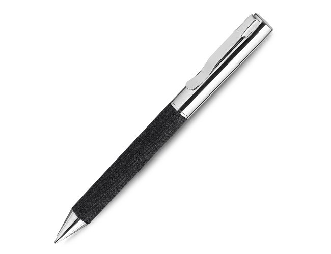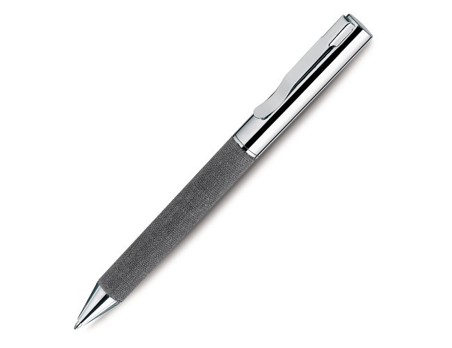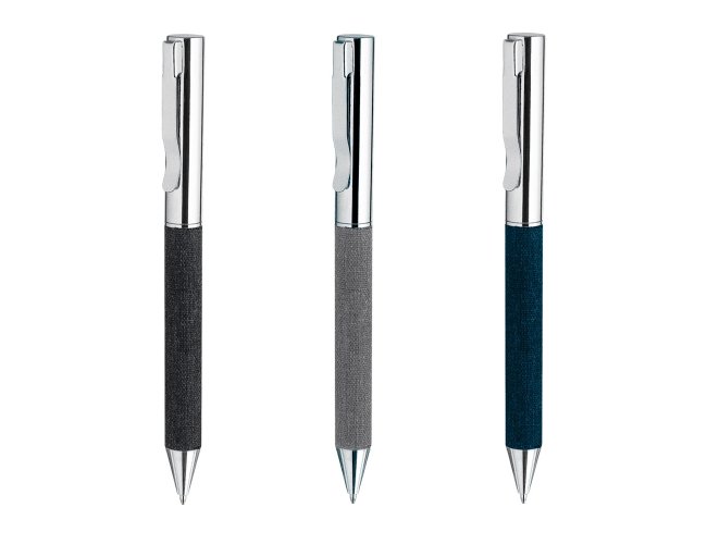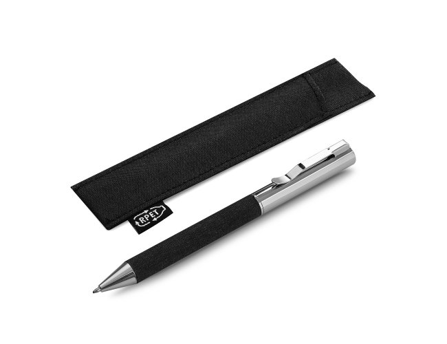 Caneta metálica com estojo em tecido RPET. A caneta possui carga esferográfica azul, acionamento por rotação e corpo com detalhe em RPET.