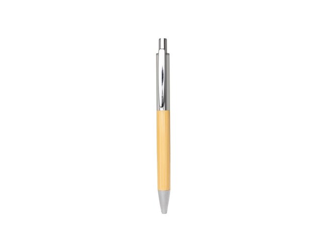 Caneta metálica com detalhe em bambu, carga esferográfica azul 1.0mm e acionamento por clique.