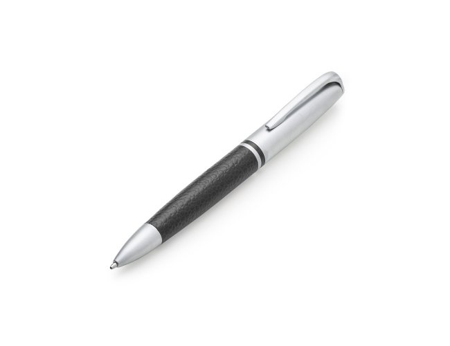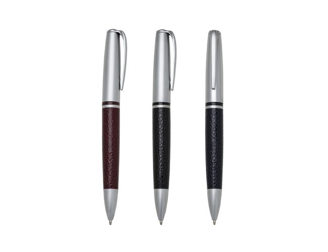Caneta metálica com detalhe em couro sintético, carga esferográfica azul 1.0 mm e acionamento por rotação.
