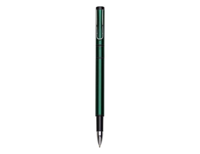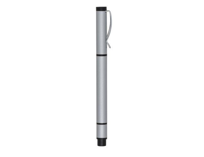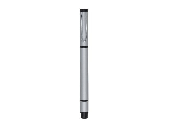 Caneta metálica com marca texto amarelo e carga esferográfica azul 1.0mm, ambas com tampas protetoras.
