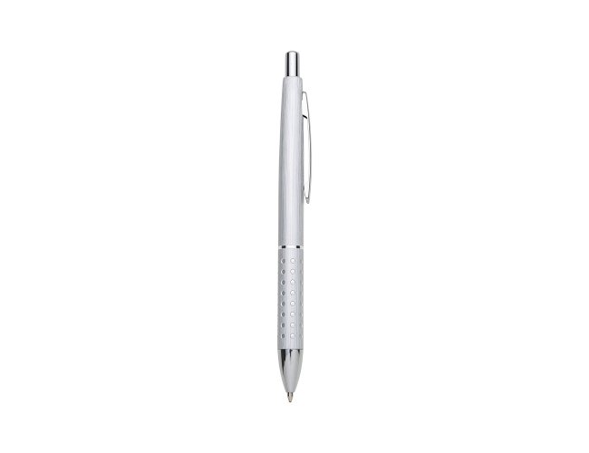 Caneta metálica com pintura escovada colorida, possui anel inferior prata e detalhes em relevo semelhante a strass. Acionamento por clique.