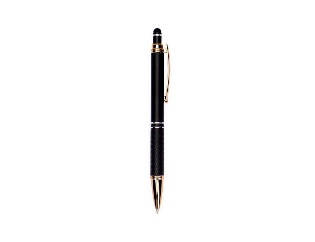 Caneta metálica touchscreen com parte inferior texturizada, acionamento por clique e carga esferográfica azul 1.0mm.