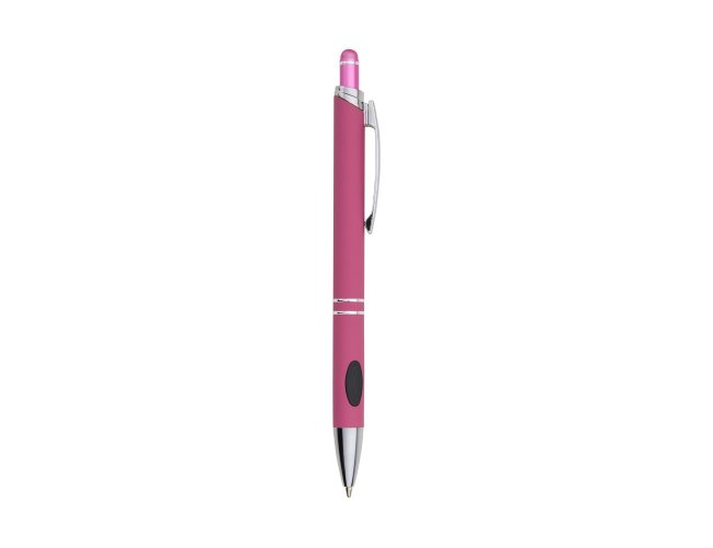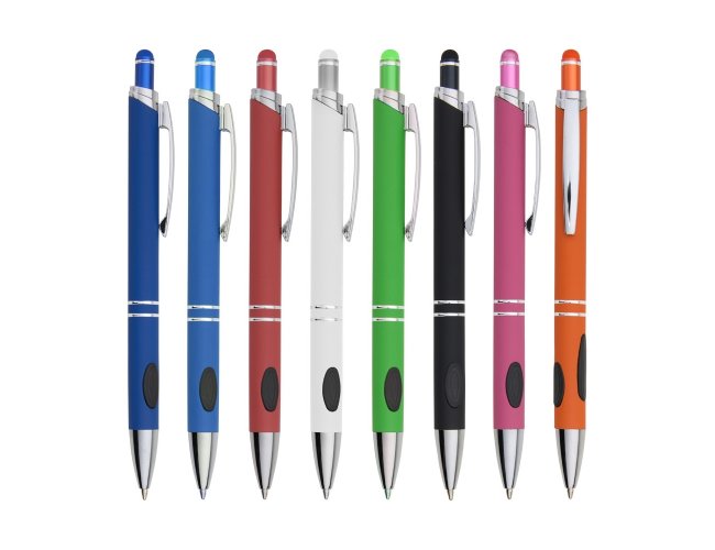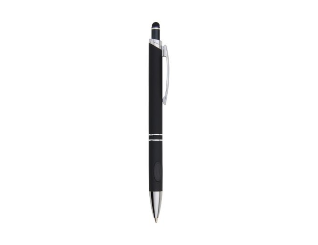 Caneta metálica touchscreen com acabamento emborrachado, acionamento por clique e carga esferográfica azul 1.0mm.