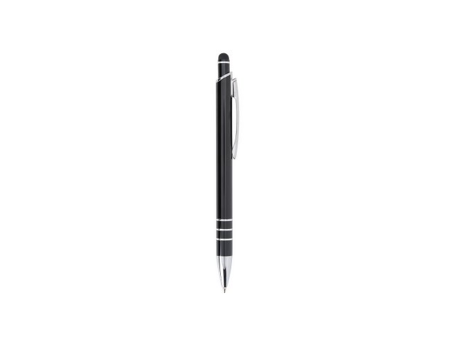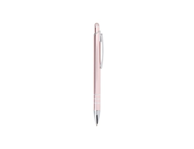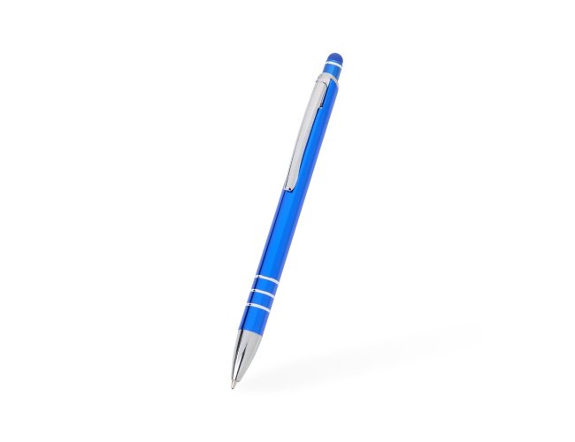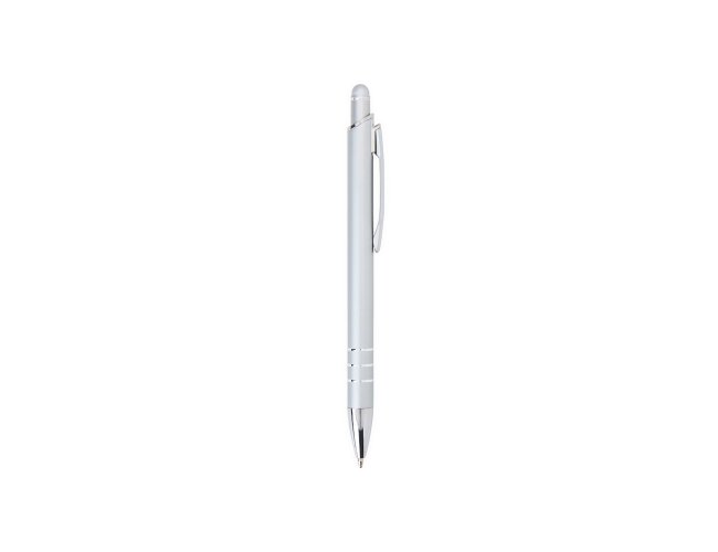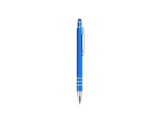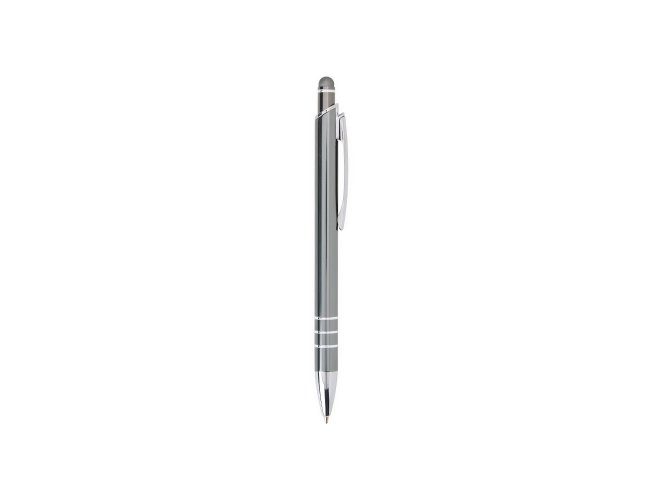 Caneta metálica com acionador touch, clipe metálico e ponteira plástica. Carga esferográfica azul 1.0mm e acionamento por clique.