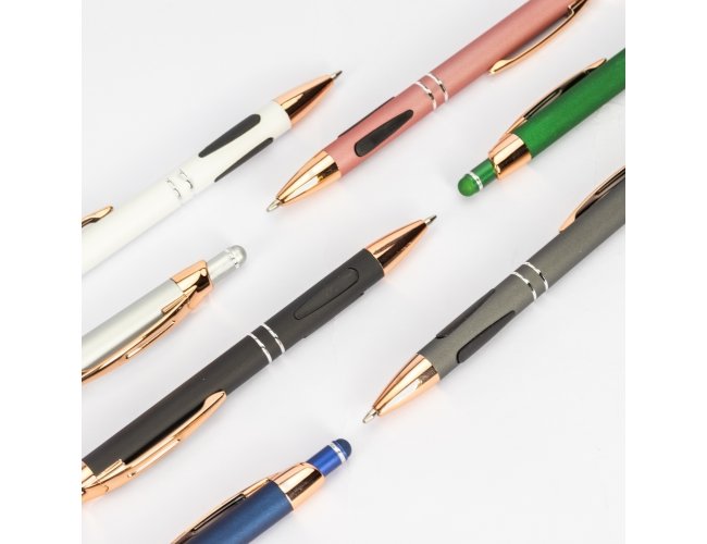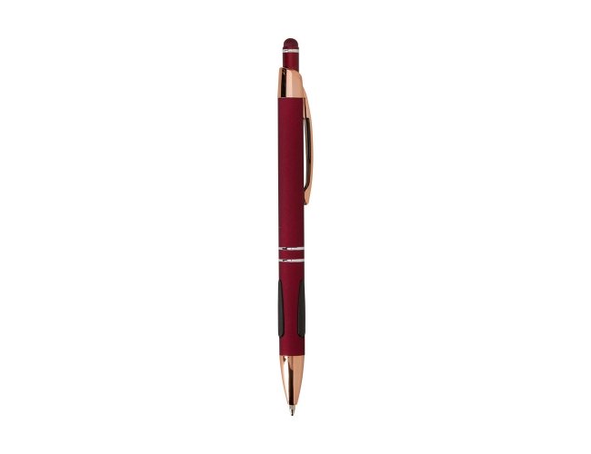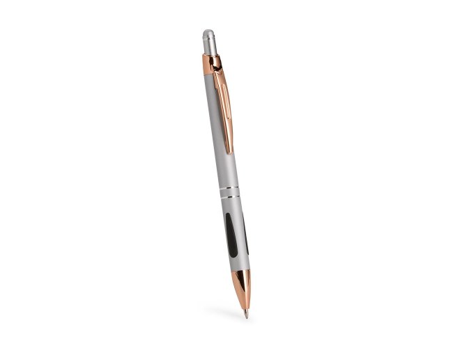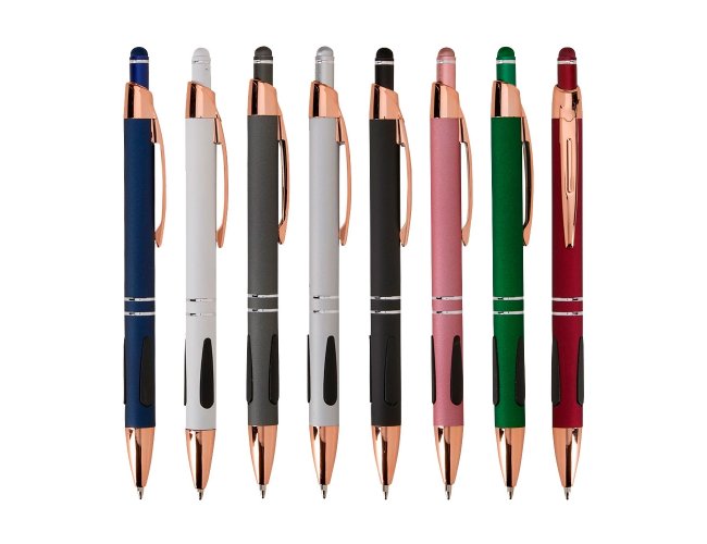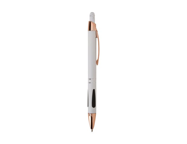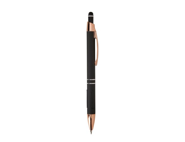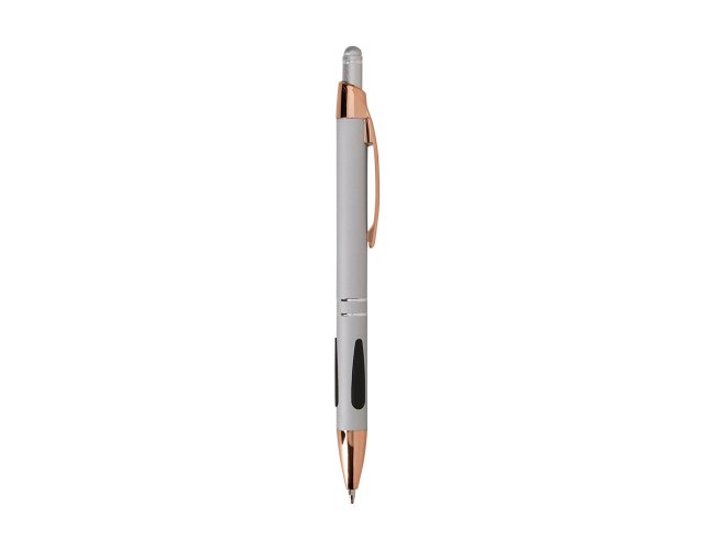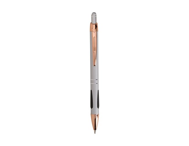 Caneta em metal com detalhes emborrachados, carga esferográfica azul de 1.0mm e acionamento por clique com acabamento emborrachado que permite seu uso como uma caneta touch para interação com dispositivos de tela sensível ao toque.
