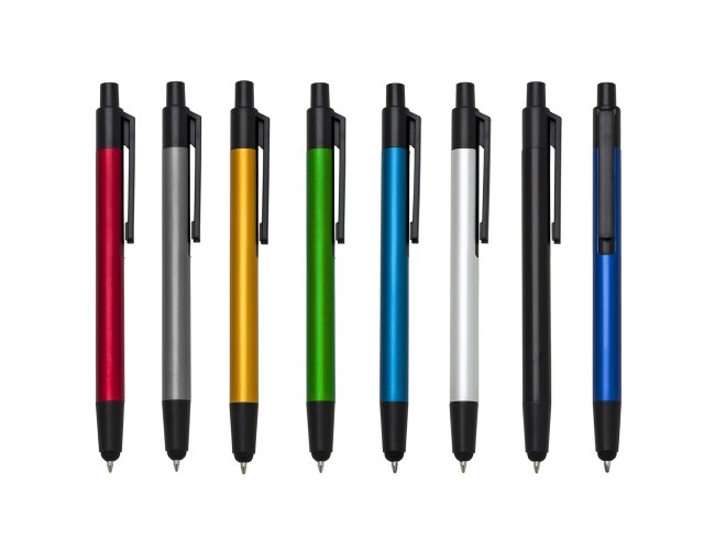 Caneta metálica com ponteira touch screen, carga esferográfica azul e acionamento por clique. OBS.: PEDIDO APENAS MÚLTIPLO DE 50 PEÇAS!