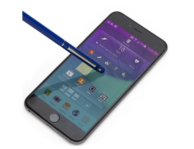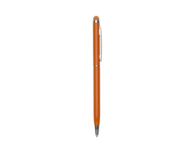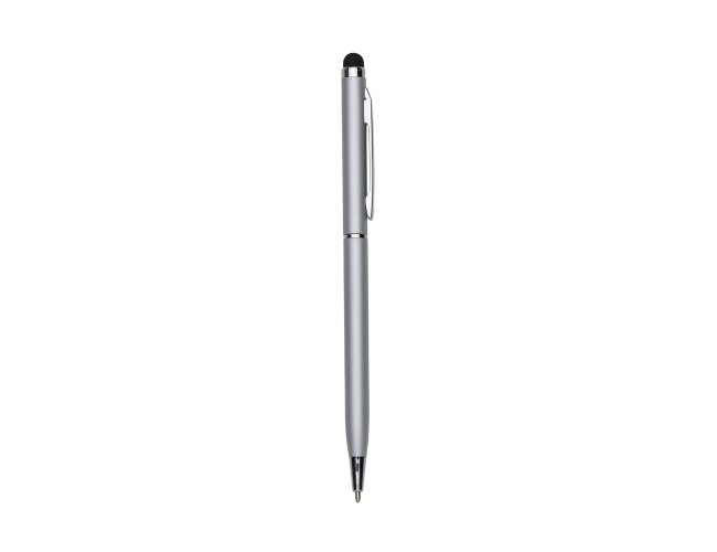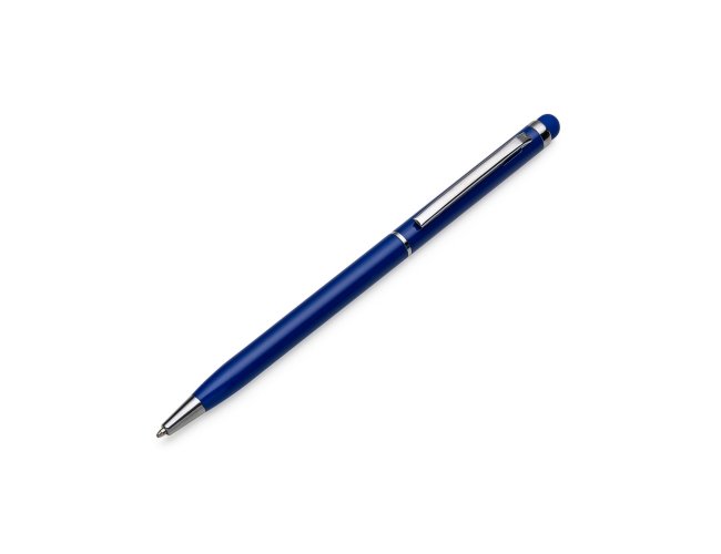 Caneta metálica com touch screen, carga esferográfica azul 1.0 mm e acionamento por rotação.