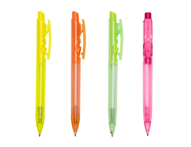 Caneta plástica com carga esferográfica azul e acionamento por clique.