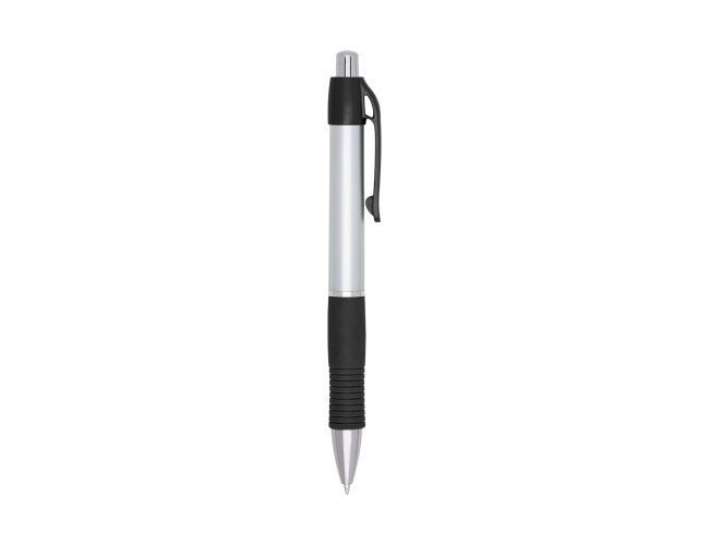 Caneta plástica com detalhe emborrachado, carga esferográfica azul 1.0 mm e acionamento por clique.