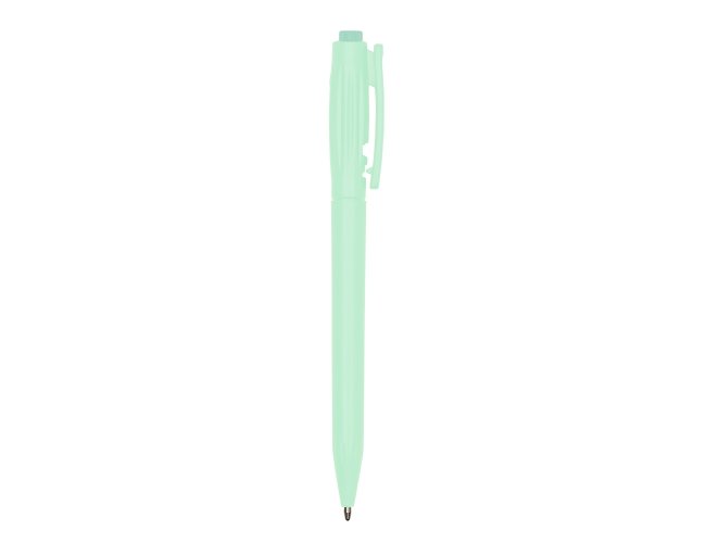 Caneta plástica com detalhes em relevo, acionamento em clique e destravamento ao pressionar a parte inferior do clip e carga esferográfica azul de 1.0mm, garantindo uma escrita precisa e pegada confortável.