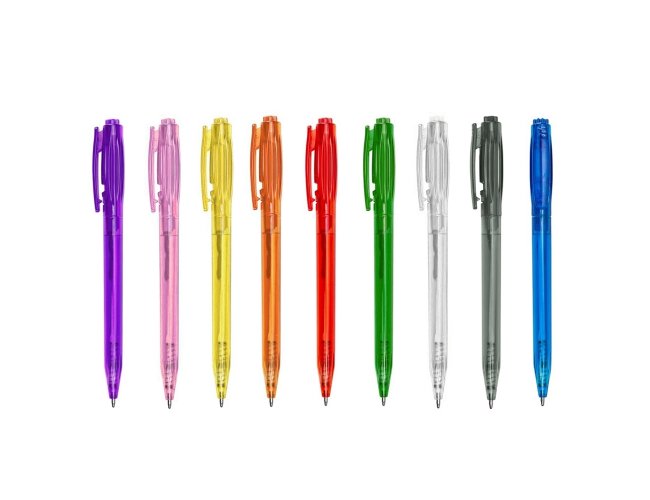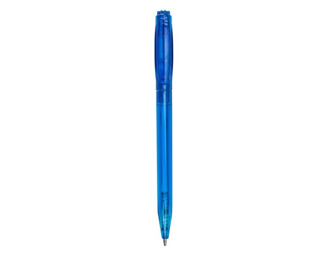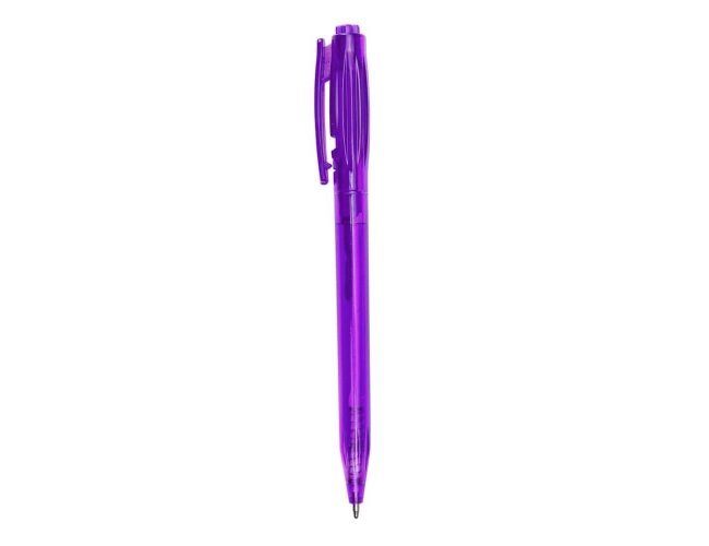 Caneta plástica translúcida com carga esferográfica azul 1.0 mm e acionamento por clique.