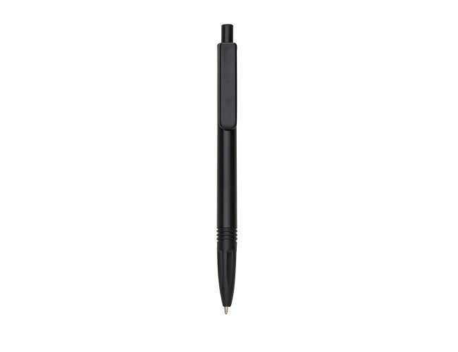 Caneta plástica com carga esferográfica azul e acionamento por clique.