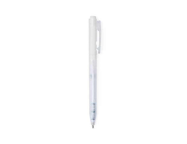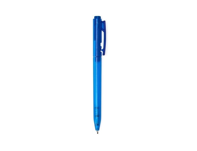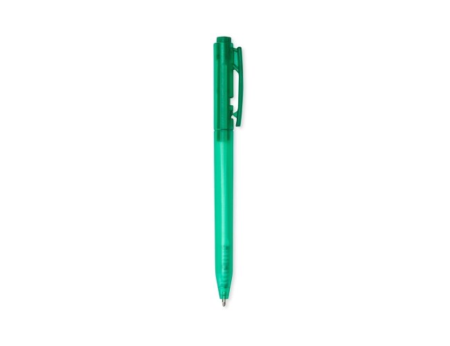 Caneta plástica translúcida com carga esferográfica preta 1mm e acionamento por clique.
