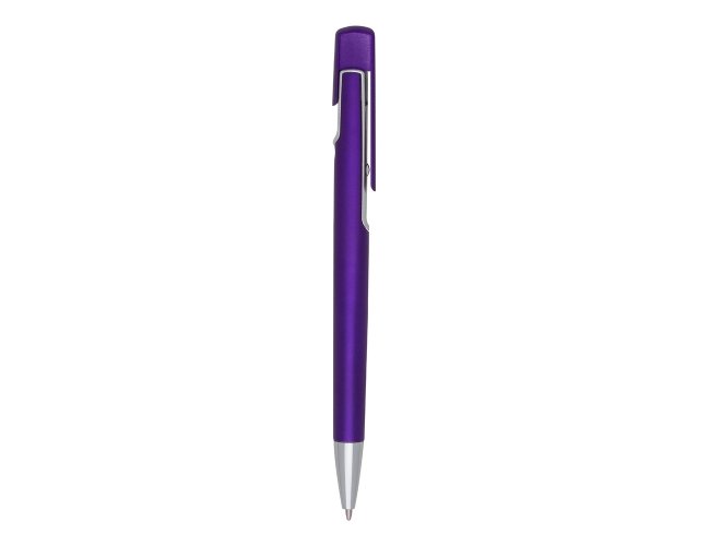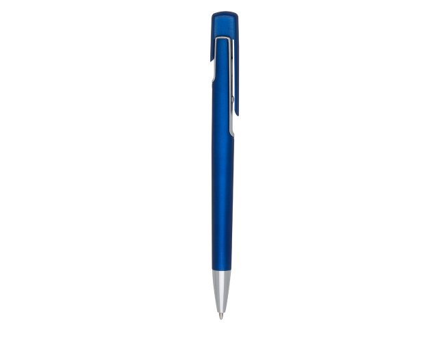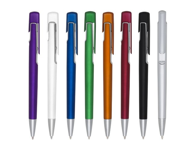 Caneta plástica com carga esferográfica azul 1.0 mm e acionamento por clique.