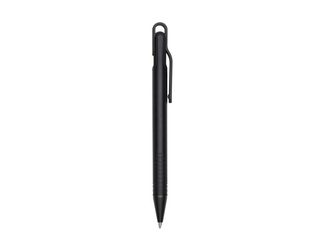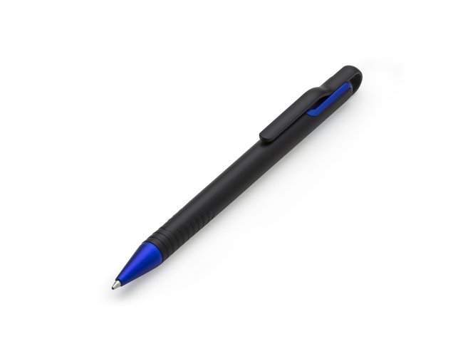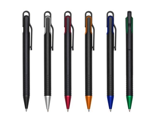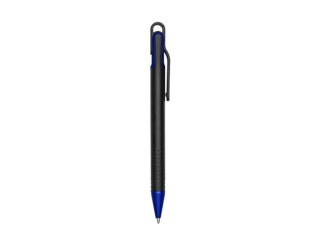 Caneta plástica com carga esferográfica azul 1.0 mm e acionamento por clique.