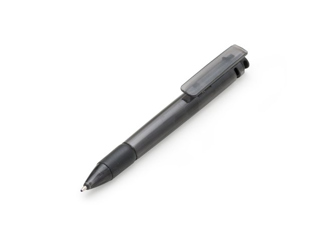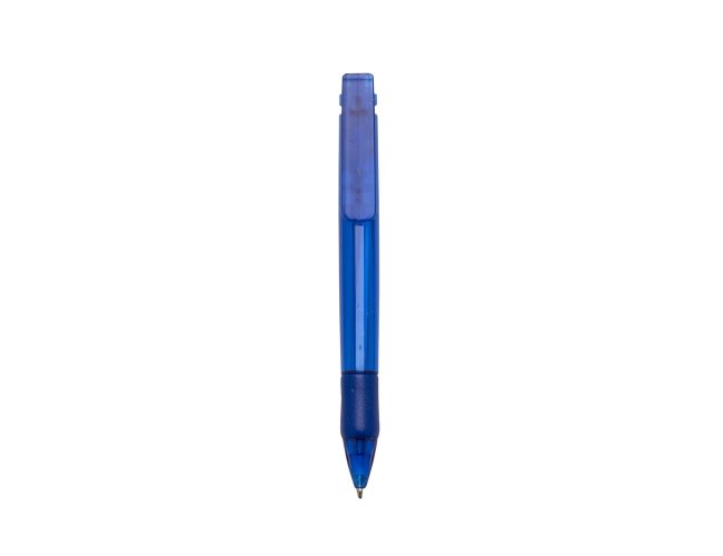 Caneta plástica com carga esferográfica azul 1.0 mm e acionamento por clique.