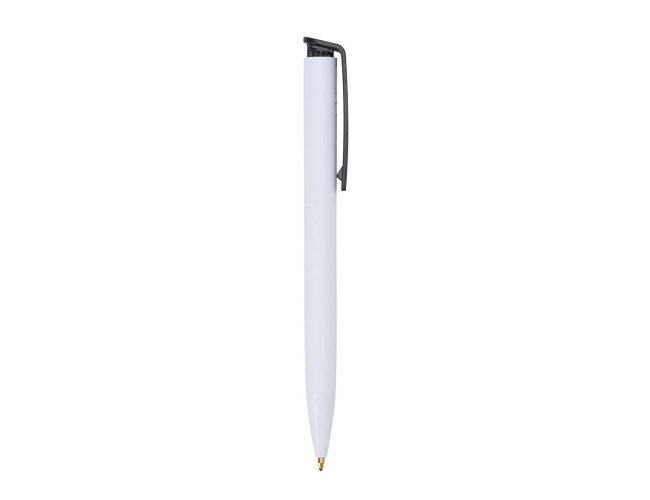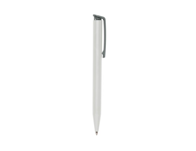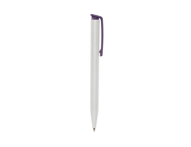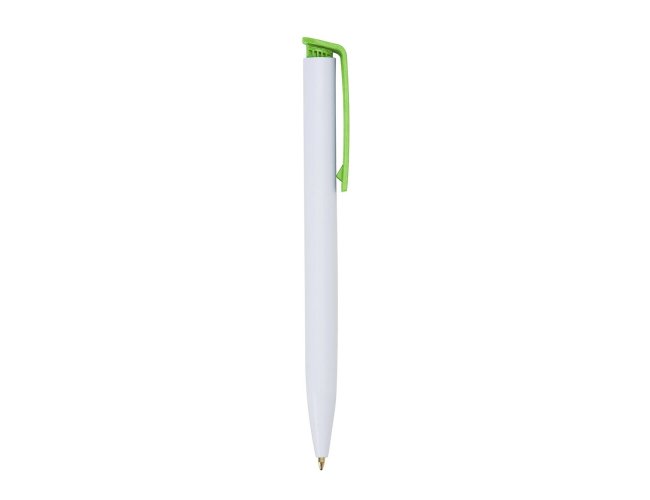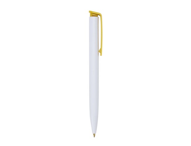 Caneta plástica com carga esferográfica azul e acionamento por clique.