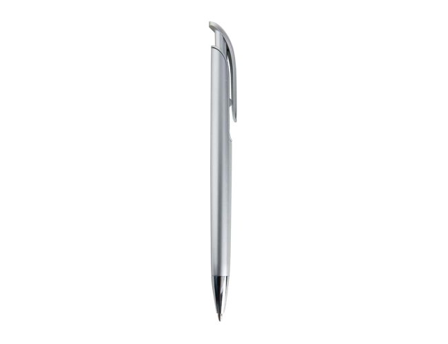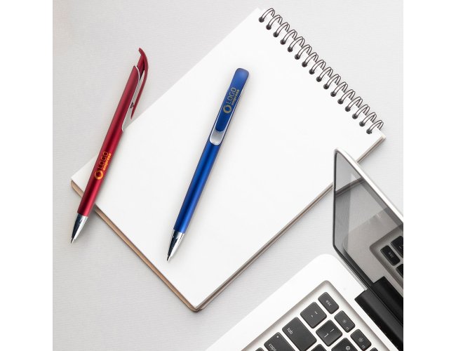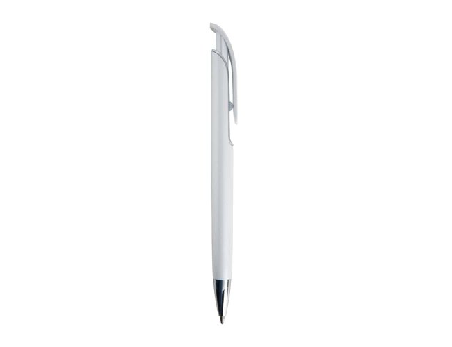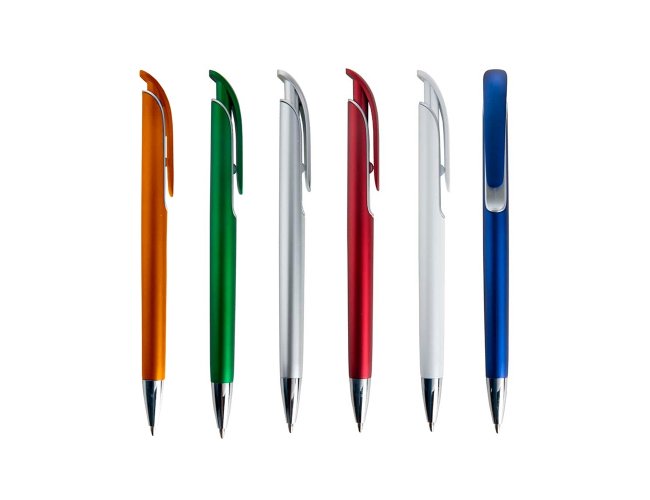 Caneta plástica com carga esferográfica azul 1.0 mm e acionamento por clique.