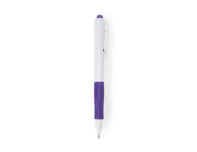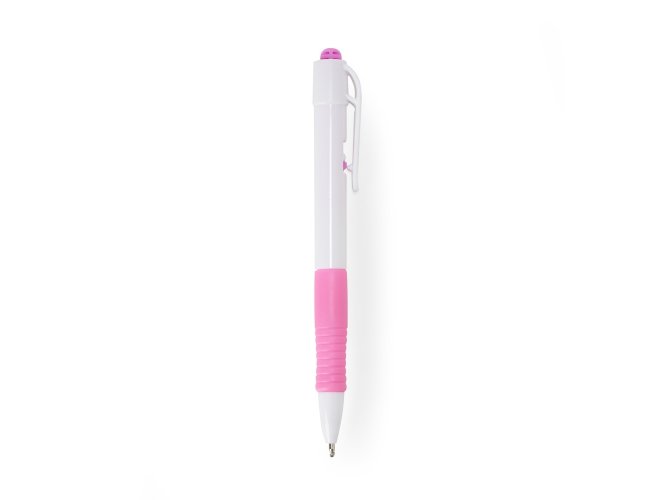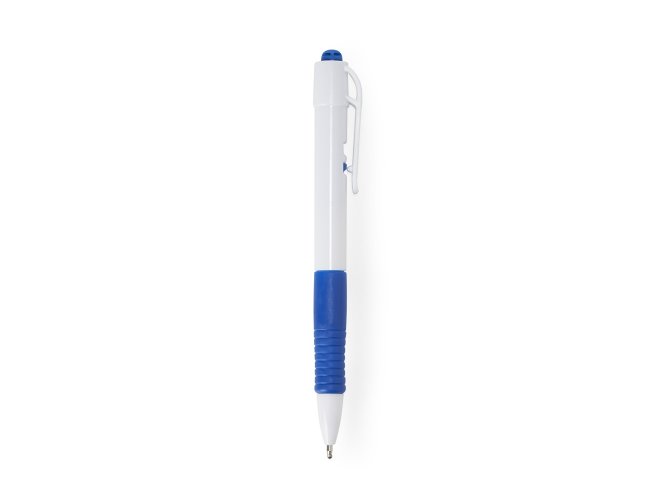 Caneta plástica com detalhe emborrachado, carga esferográfica azul 1.0 mm e acionamento por clique.