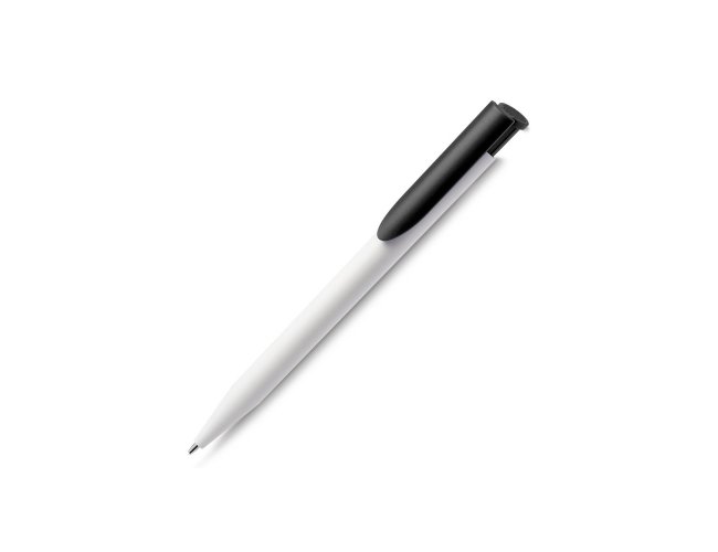 Caneta plástica com carga esferográfica azul 1.0mm e acionamento por clique.