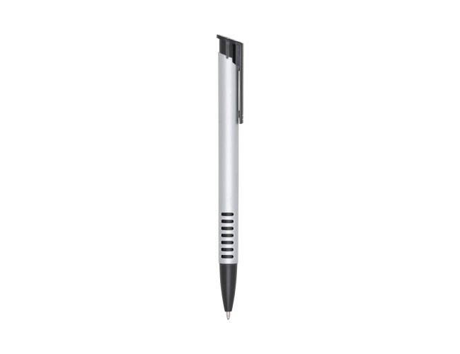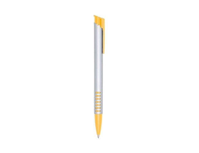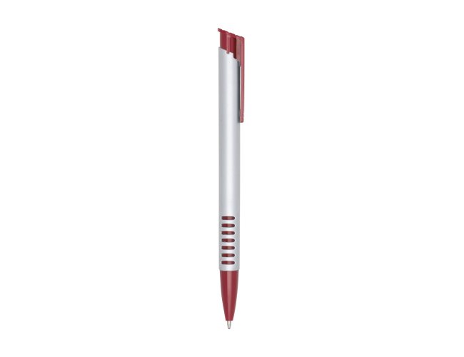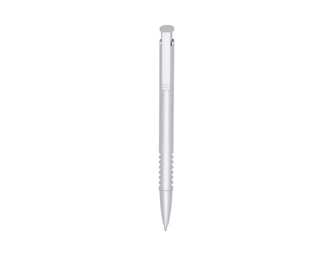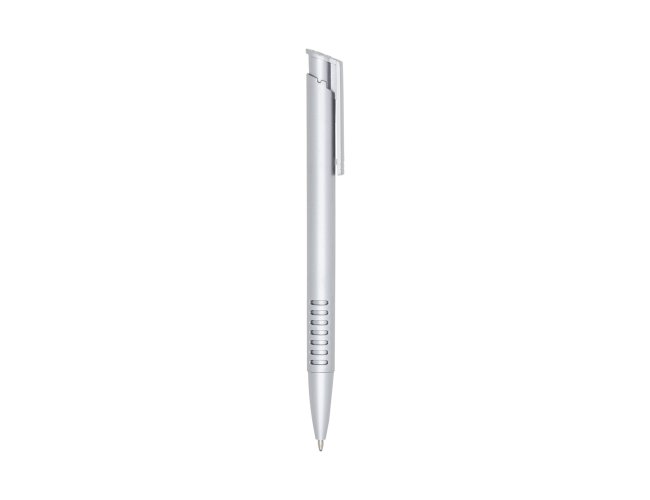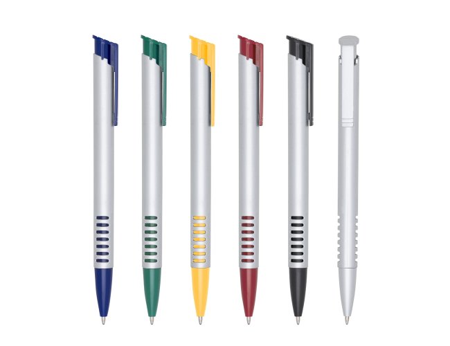 Caneta plástica com carga esferográfica azul 1.0 mm e acionamento por clique.