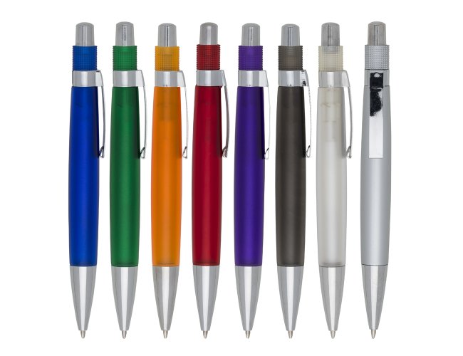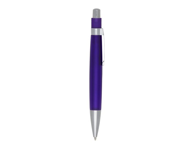 Caneta plástica com carga esferográfica azul e acionamento por clique.