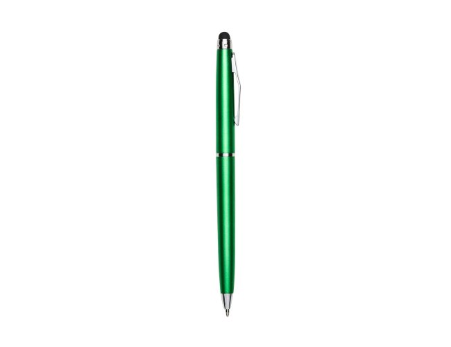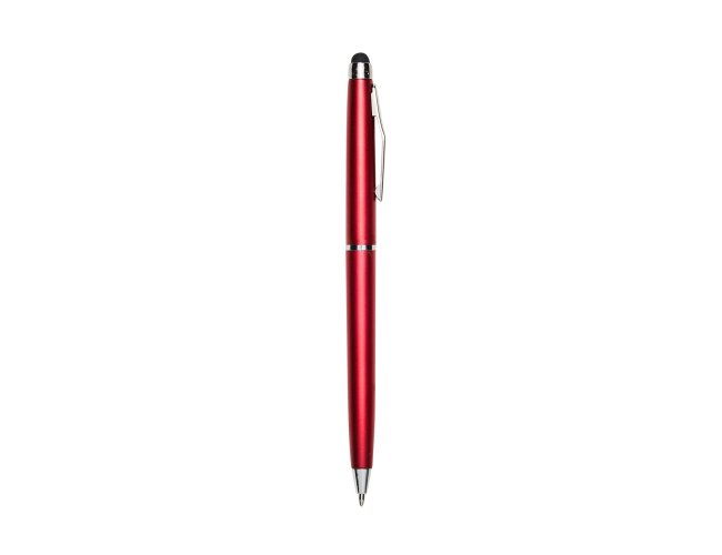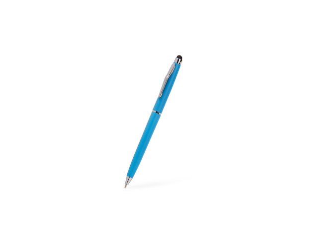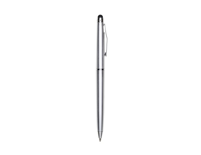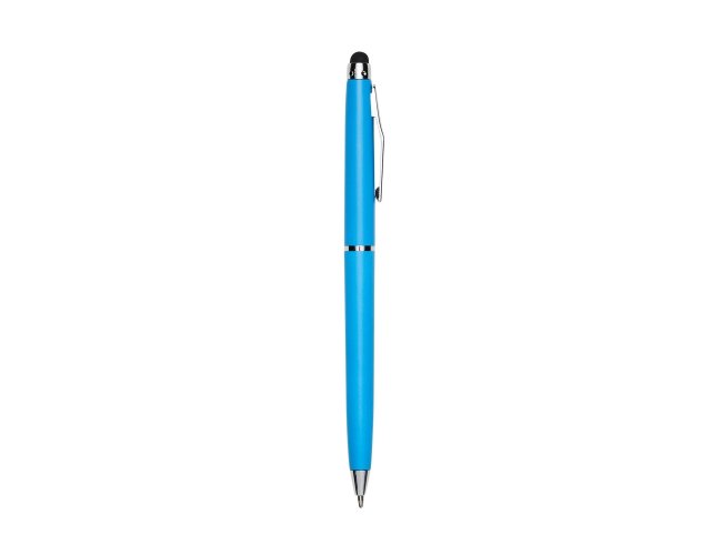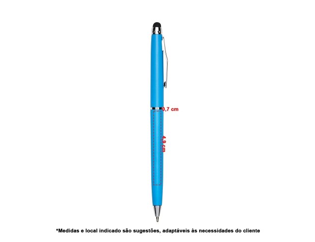 Caneta plástica touch screen com acionamento por rotação e carga esferográfica azul 1mm.