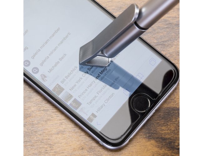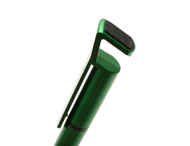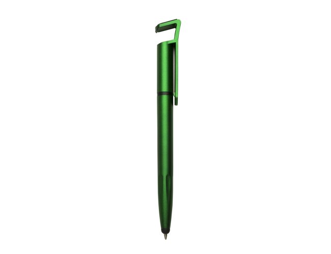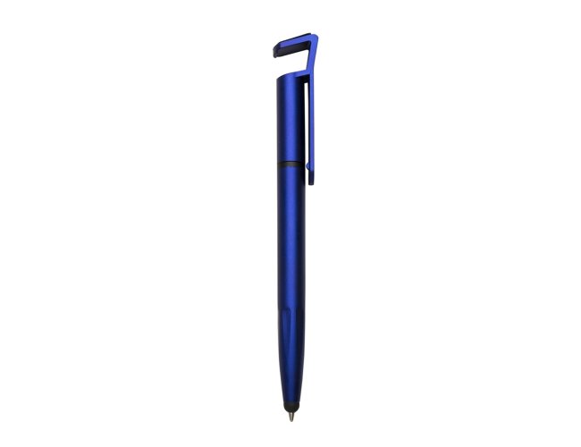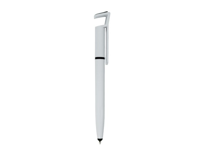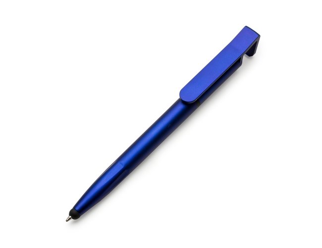 Caneta plástica com suporte para celular, ponteira touch screen e limpador de tela. Carga esferográfica azul 1.0 mm e acionamento por rotação.