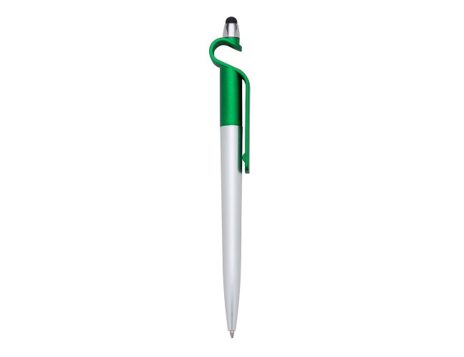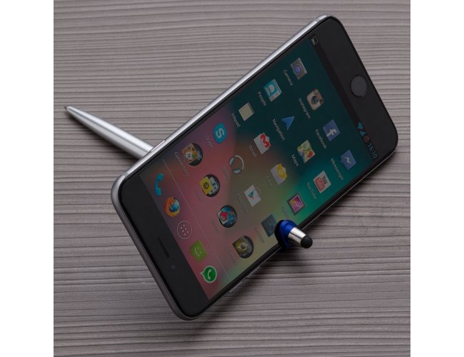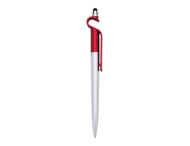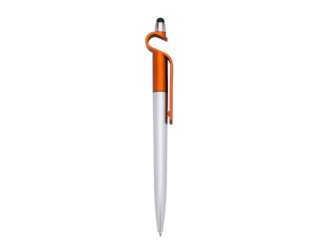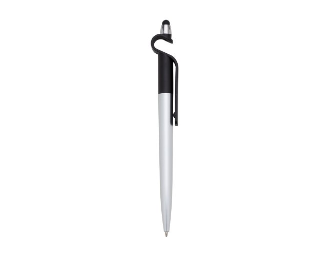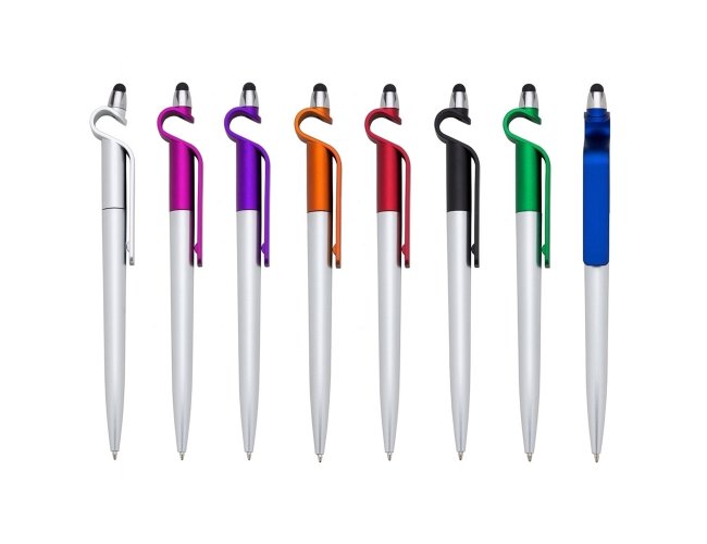 Caneta plástica com suporte para celular e touch screen. Carga esferográfica azul e acionamento por rotação.