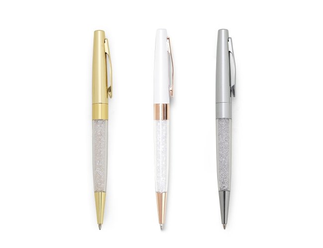 Caneta semimetálica com detalhes em cristal, carga esferográfica azul e acionamento por rotação.