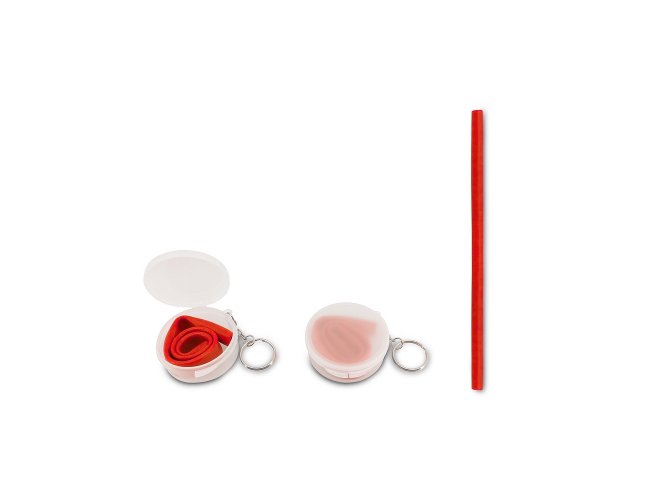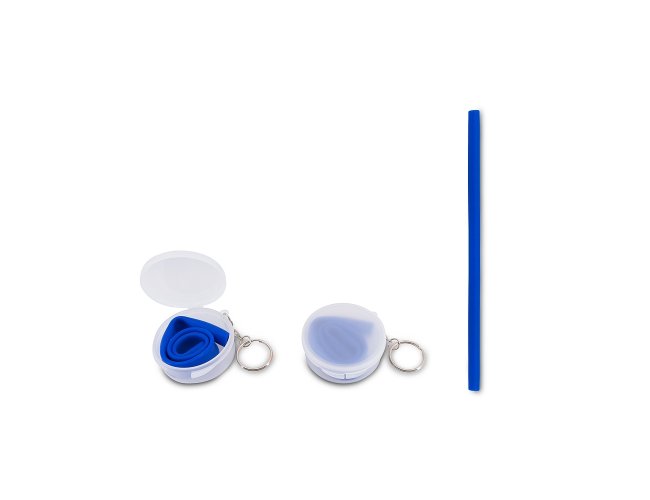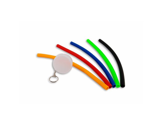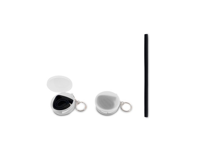 Canudo flexível de silicone em estojo plástico fosco com chaveiro.