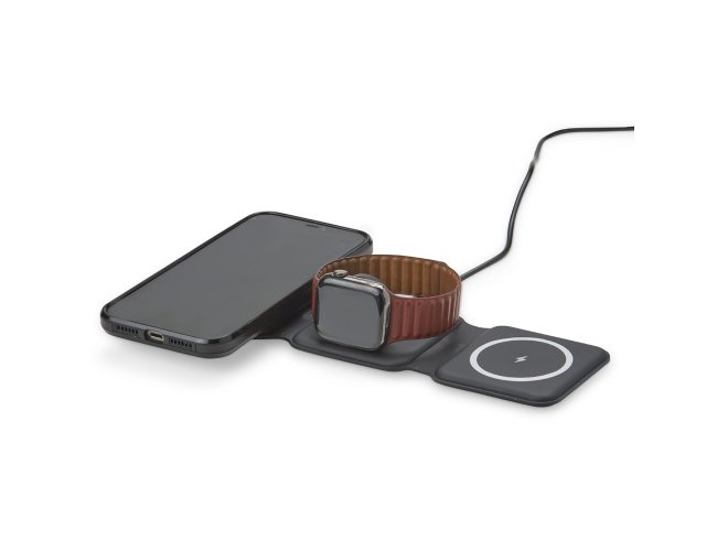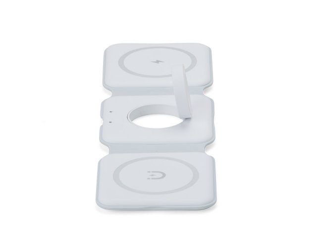 Carregador via indução magnética para dispositivos da Apple. O dispositivo permite o carregamento de até três dispositivos ao mesmo tempo, como celulares, Apple Watch e o case dos fones da linha AirPod. Acompanha cabo USB-C.