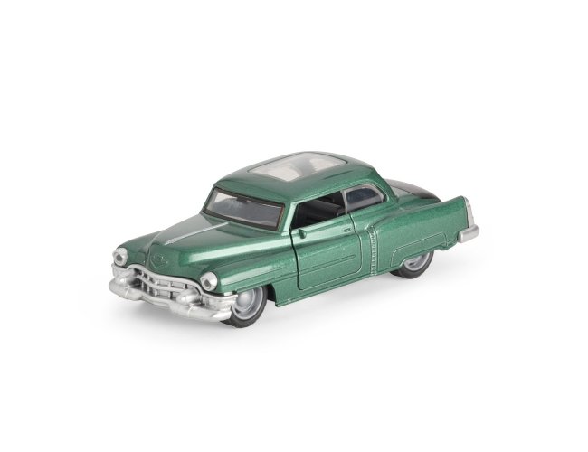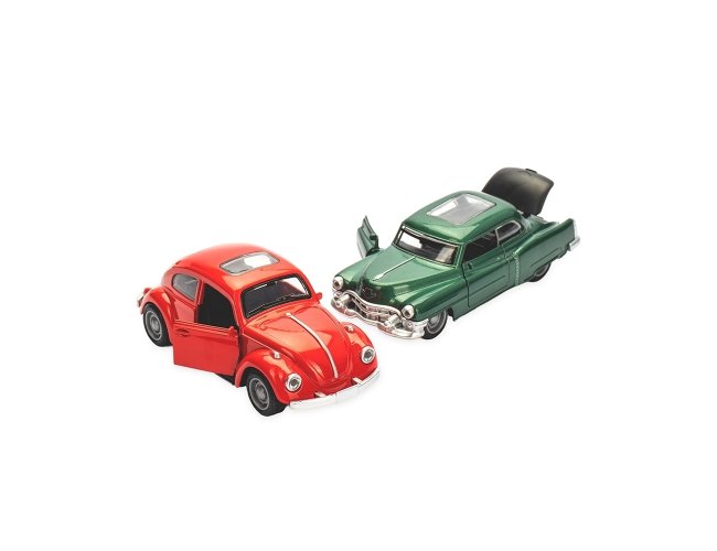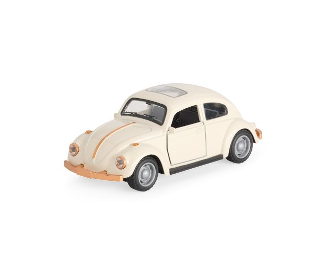 Carro em miniatura inspirado em modelos vintage. Apresenta estrutura em metal e plástico, teto solar decorativo, mecanismo de fricção nas rodas traseiras, portas e tampa do motor/porta-malas com abertura funcional.