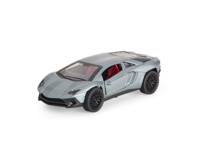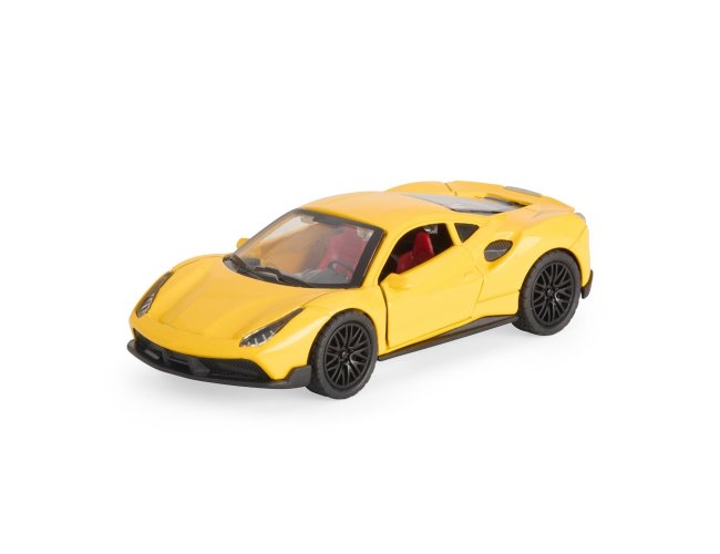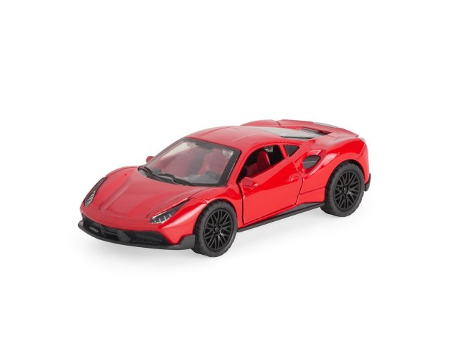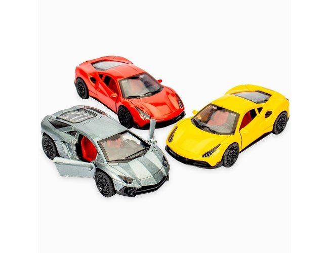 Carro esportivo em miniatura com estrutura em metal e plástico. Possui portas e tampa do motor com abertura funcional, além de rodas traseiras com mecanismo de fricção.