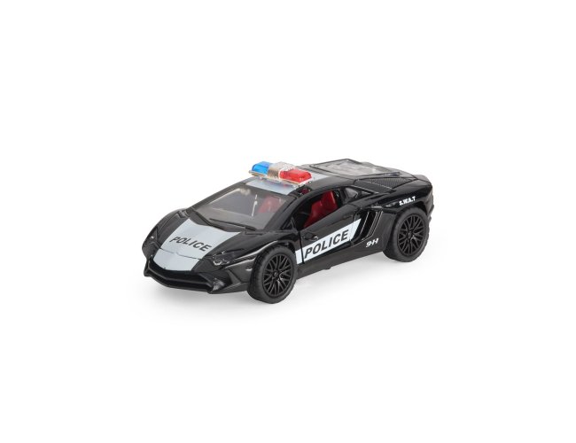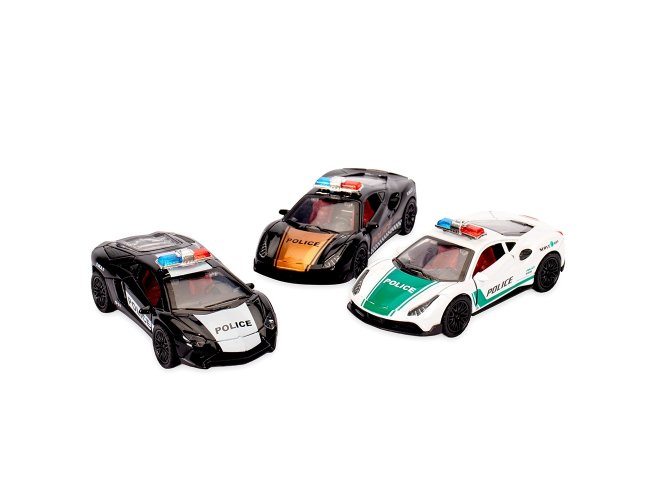 Carro esportivo em miniatura com decoração policial e estrutura em metal e plástico. Conta com fricção nas rodas traseiras, portas e tampa do motor com abertura funcional.