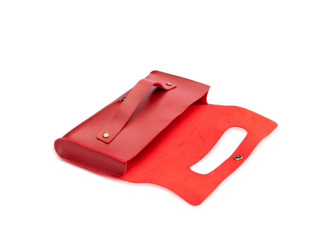Carteira de mão com alça para transporte. Confeccionada em couro sintético, possui revestimento interno com textura aveludada e fechamento por botão de pressão.