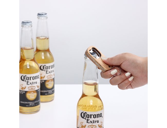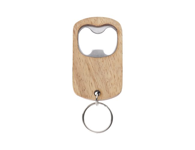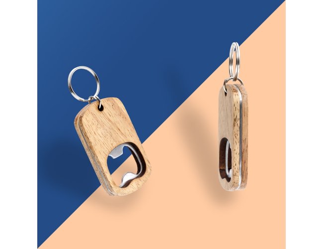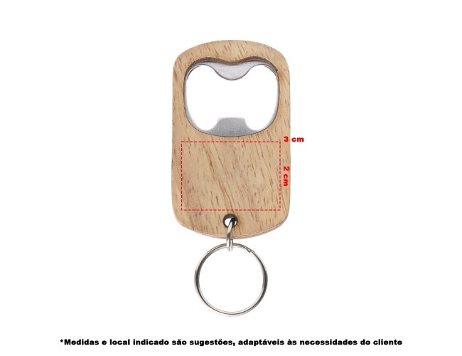 Chaveiro em madeira com abridor de garrafas em metal e argola de ferro niquelado.